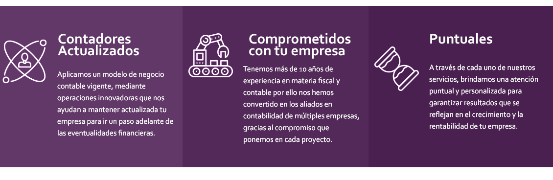 ¿Quiénes somos?Somos un grupo de profesionales del área de la administración y finanzas, por ello buscamos que PUNTO EXACTO sea reconocido a nivel nacional, no sólo por ser prestadores de servicios en materia contable, sino por ser los mejores aliados para tu negocio o empresa, porque nos satisface crecer de la mano de nuestros clientes. Ante los constantes cambios en las reformas fiscales, nace PUNTO EXACTO, un grupo de contadores profesionales, quienes compartimos como misión laboral la firme convicción de ofrecer soluciones efectivas y asesoramiento fiscal a cada uno de nuestros clientes, bajo la garantía de recibir una atención personalizada y especializada. Nuestra experiencia en el ramo de la contabilidad nos ha otorgado la capacidad de facilitar las relaciones que involucran al fisco y a los contribuyentes. Nuestra calidad, honestidad, confidencialidad, integridad y constancia nos han llevado a mantener una línea de trabajo comprometida y transparente. |