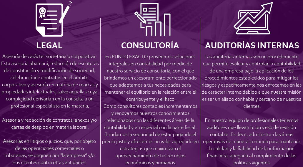 En Punto Exacto brindamos servicios transparentes y cuidamos el estado financiero de cada uno de los clientes que confían en nosotros. Por ello, estamos a tu disposición y aclaramos todas tus dudas en materia contable para colaborar de manera íntegra, brindando soluciones confiables y efectivas.